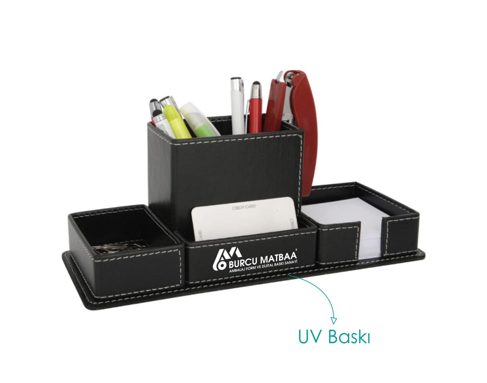 Ürün ölçüleri 28,5 x 10,5 x 11 cm olup masa üzerinde özellikle düzenli kullanım sağlar. Bununla birlikte içerisinde kartvizit bölmesi, notluk ve ataçlık bulunmaktadır. Ayrıca ürün baskısız olarak kullanılabileceği gibi isteğe bağlı olarak UV baskı renkli ile logonuz veya marka isminiz eklenebilmektedir. Bununla birlikte daha fazla ofis aksesuarı için Mağaza sayfasını inceleyebilirsiniz.